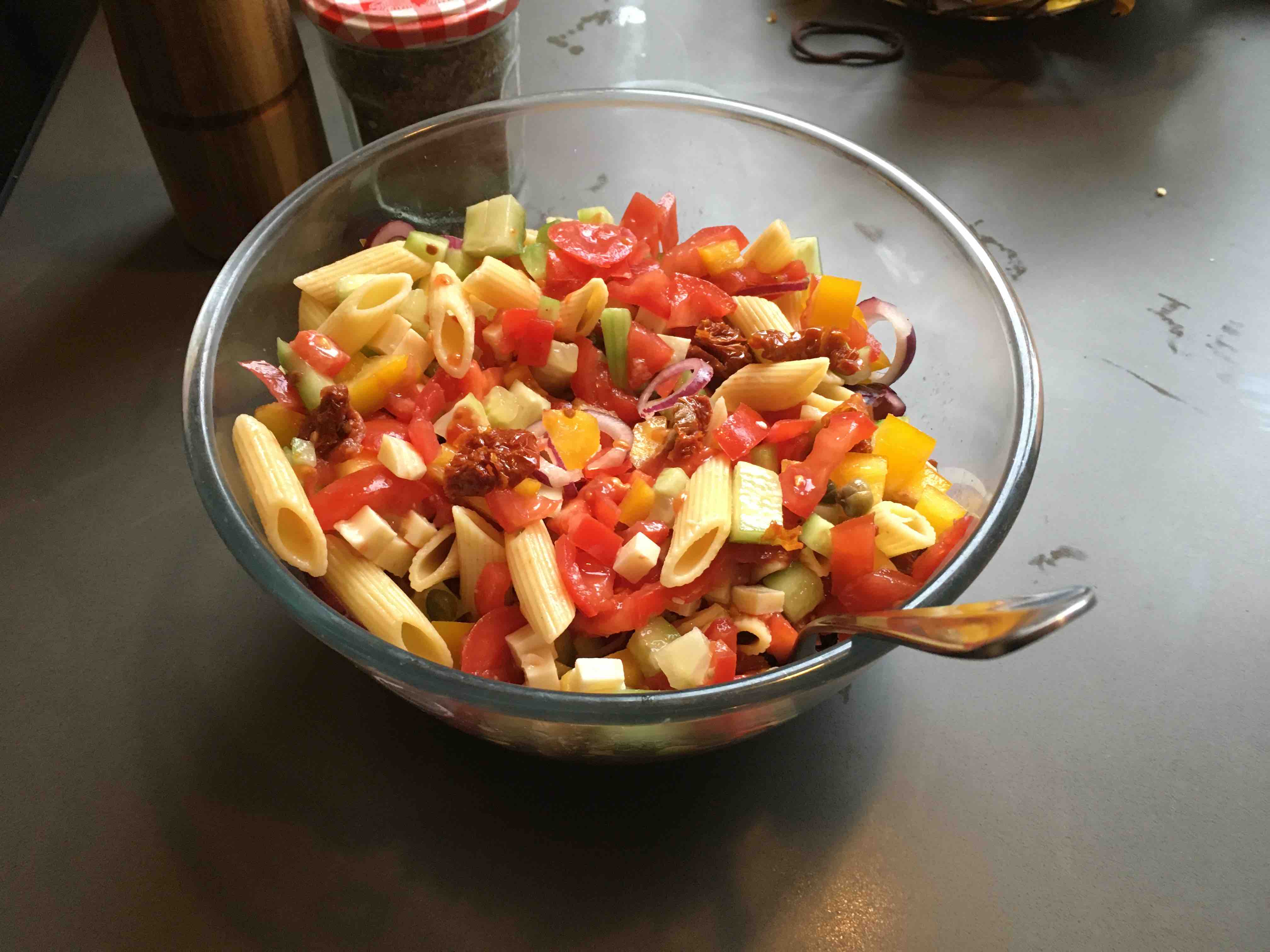 Oft koche ich sogar extra zwei Portionen, um am nächsten Tag noch Teigwarensalat in die Schule mitzunehmen.